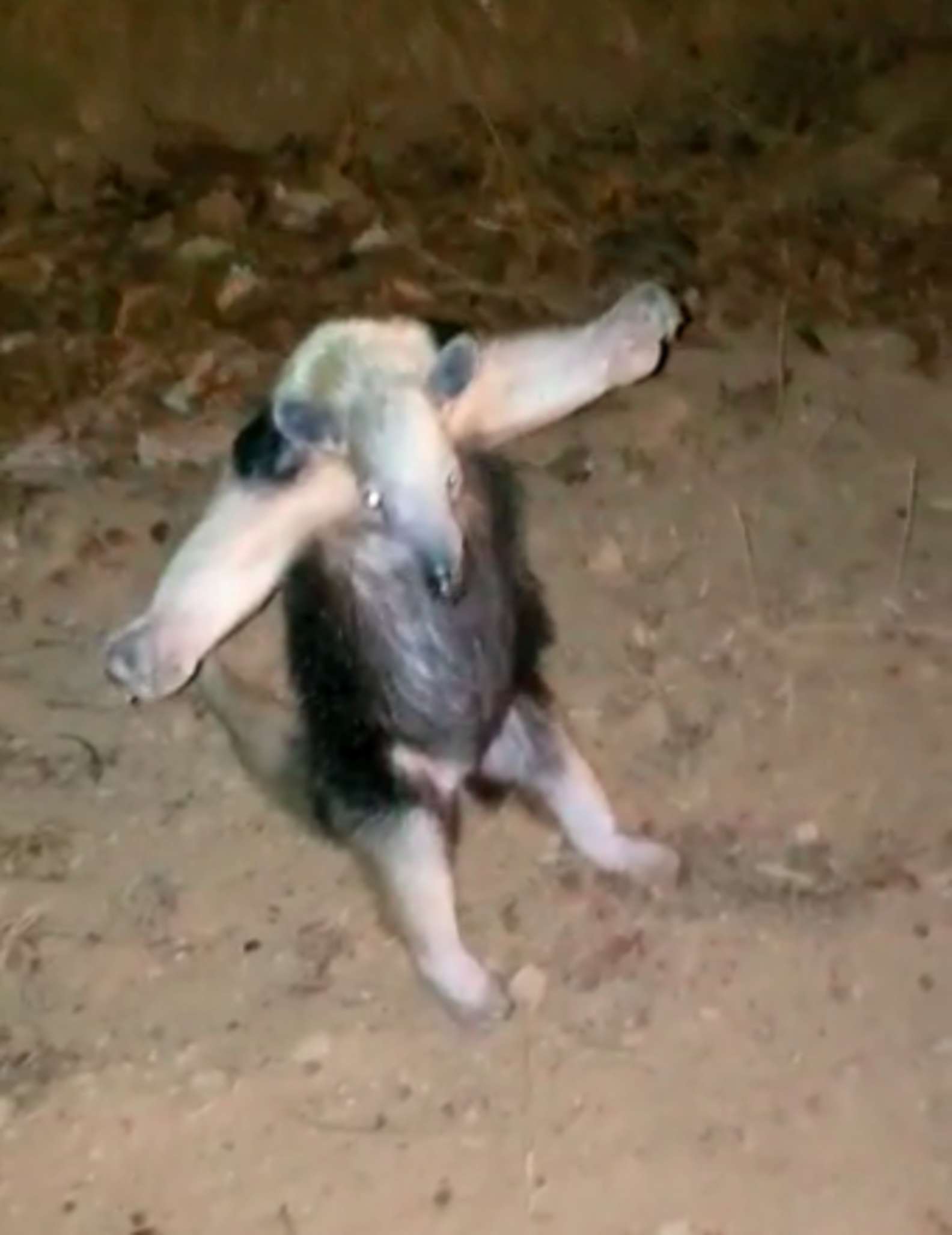 ▼食蟻獸跑了一段路後突然停下,張開雙臂似乎在向消防員討抱抱。其實牠這樣做是因為害怕。Dutra說:「牠感覺自己受到威脅,所以停下站起來做出這樣的動作。牠想讓自己的體型看起來大一些,讓我們害怕牠。」