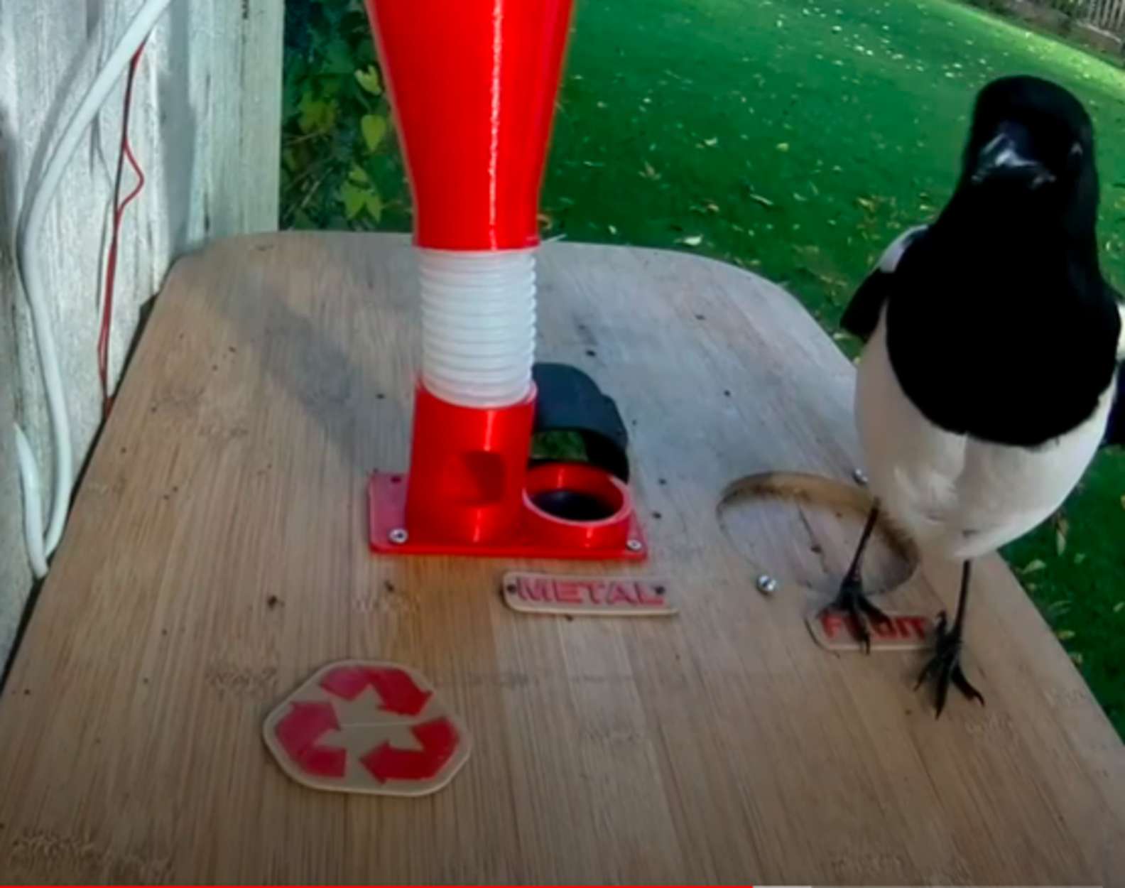 ▼Hans突發奇想:既然喜鵲這麼聰明,自己能不能訓練牠們幫忙撿垃圾呢?他決定試試看!Hans設計了一個精巧的裝置,只要喜鵲將瓶蓋等小物放進裝置裡,就會有食物掉出來。