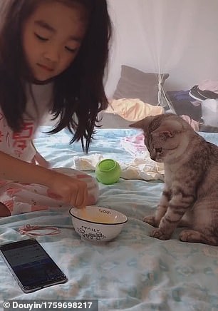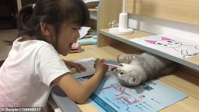 ▼仔仔和主人生活在江蘇,那天主人拍下了牠打擾女兒寫功課的一幕。從影片中可以看到,小女孩正專心寫功課,仔仔則懶洋洋躺在書桌上,不時伸手干擾小主人,想讓她關注自己。仔仔似乎在說:「枯燥的功課太無聊了,不如跟我玩吧!」
