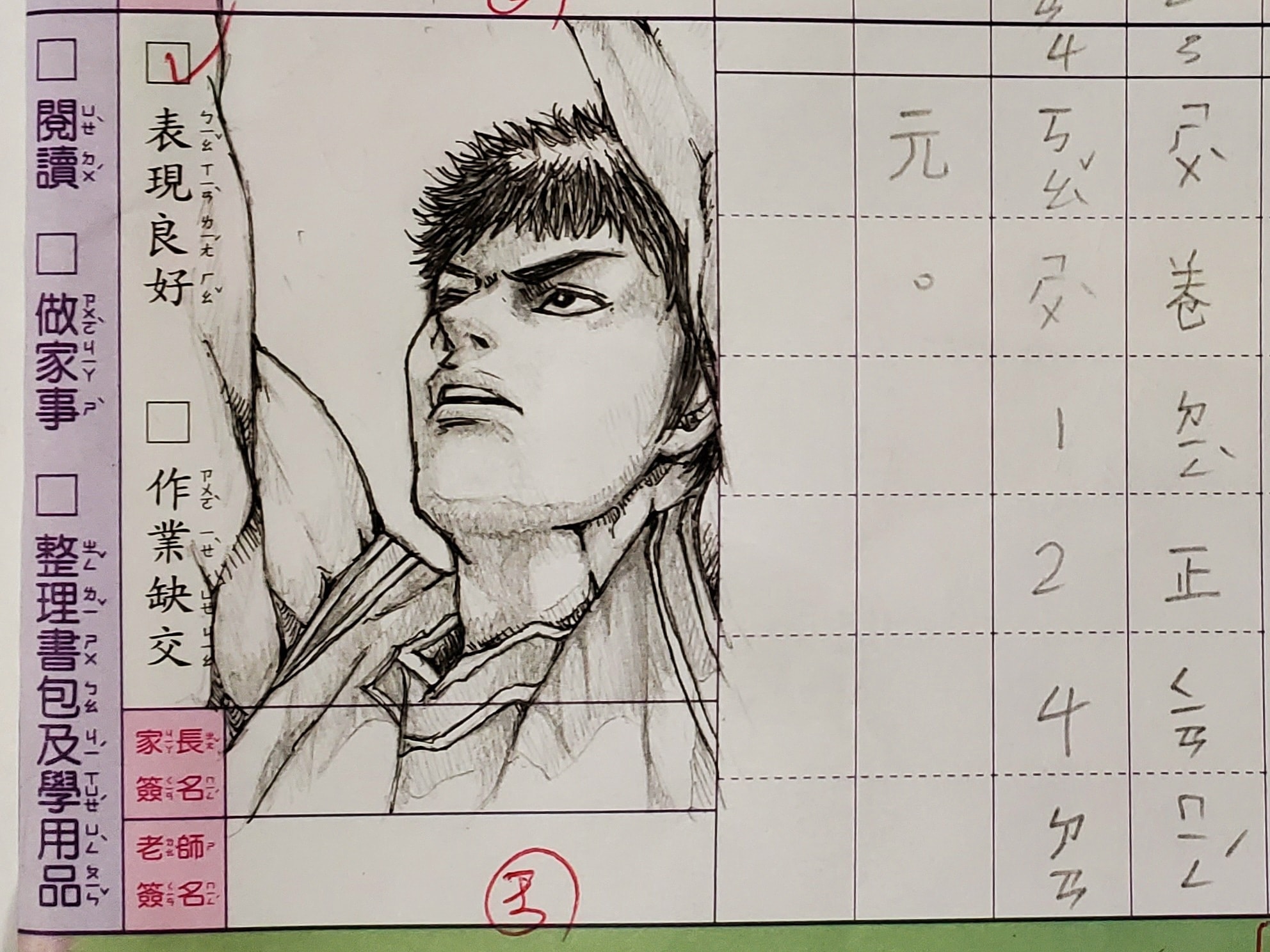 ▼原po分享6張照片,全都是聯絡簿上的畫作。他將親師留言版當成畫布,一天畫一個經典動漫《灌籃高手》中的角色,有櫻木花道:
