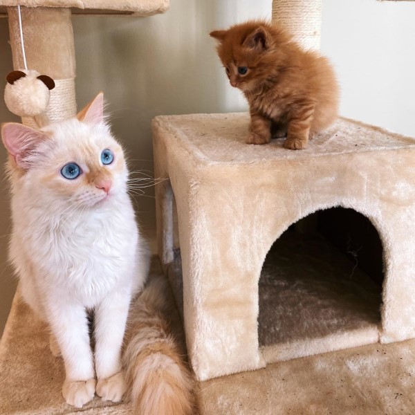 ▼平時Hank喜歡跳到窗台上,或趴在貓塔上休息,Cheese也有樣學樣,還會喵喵叫著跟貓咪姐姐招呼。Cheese被巴頭好幾次後,Hank終於開始正視這隻黏人的小貓,還會跟牠一起頭靠著頭睡覺。