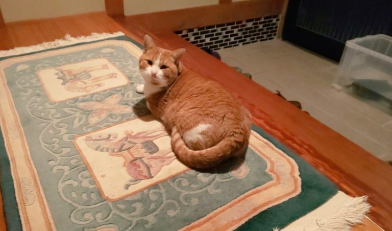▼這隻橘貓一點也不怕人,牠在玄關睡飽後,又跑去柔軟的地毯上休息。推主覺得很不可思議,一直在觀察牠,牠也抬頭回望推主,似乎在說:「只是借你家休息一下,你應該不會介意吧?」