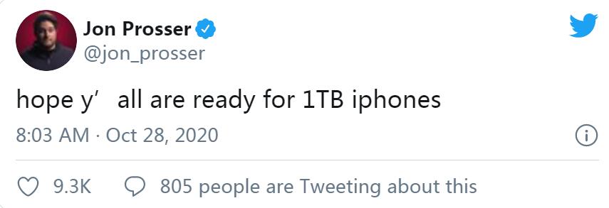2020年11月02日蘋果今年新推出的iPhone 12系列的最大儲存容量依然為512GB,日前國外消息達人Jon Prosse在推特上發文表示,1TB的iPhone或即將出現。