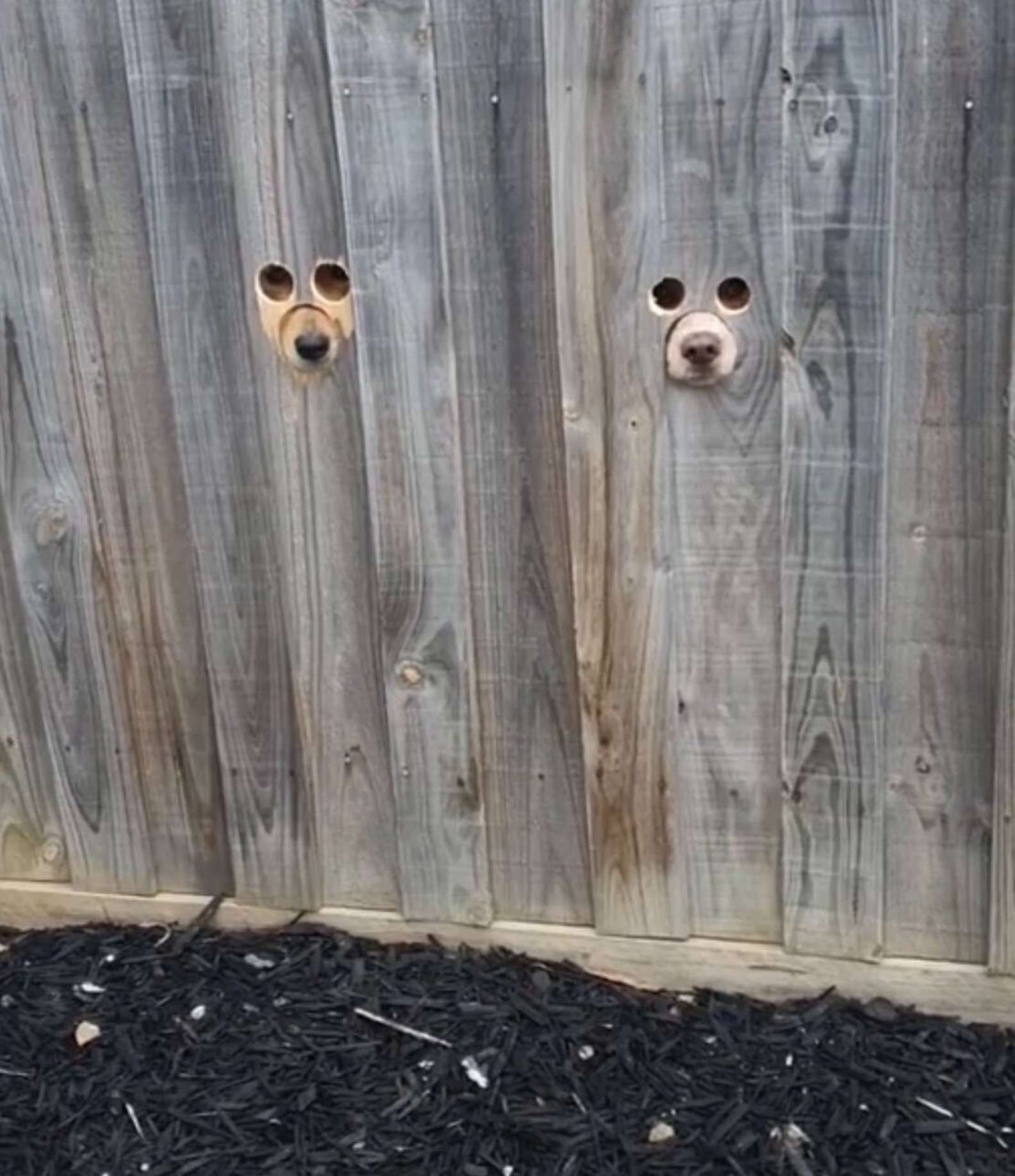 ▼Erin家的2隻狗狗分別是Billie和Seymour。剛開始朋友在圍欄上挖了3個洞,讓狗狗們能透過小洞看外面的風景。這些小洞挖得很可愛,狗狗們非常喜歡,只要聽到外面有動靜,牠們就輪流來觀察。