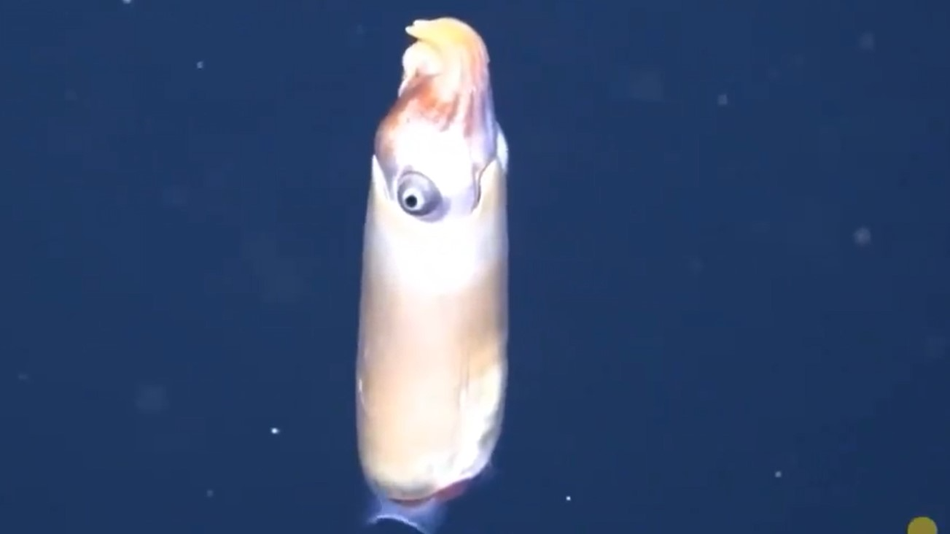 ▼施密特海洋研究所(Schmidt Ocean Institute)在海平面下約842公尺處拍到了這個小小的圓柱形生物。牠垂直漂浮著,觸鬚向上,兩片鰭在水中蕩漾。發現探測工具後,牠釋出墨水逃走,很快就消失在鏡頭中。