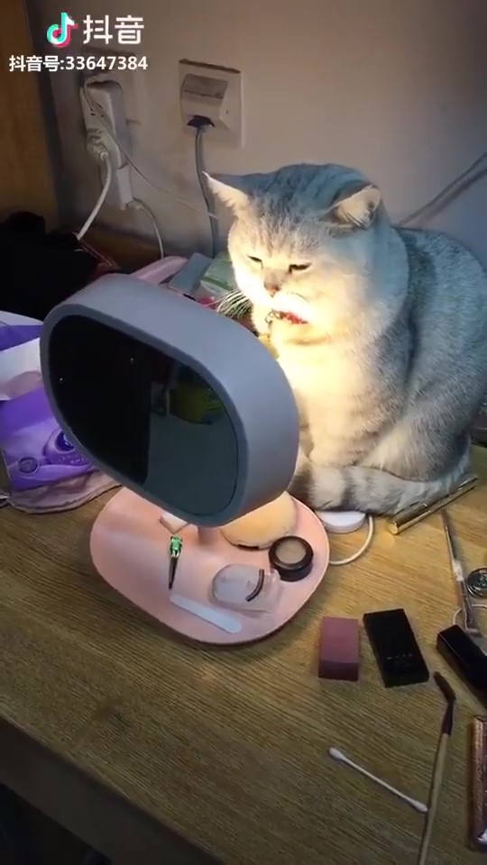 化妝燈一點都不暖和,貓咪卻還超認真又享受的一直在那裡烤,這反差萌真的太可愛了!