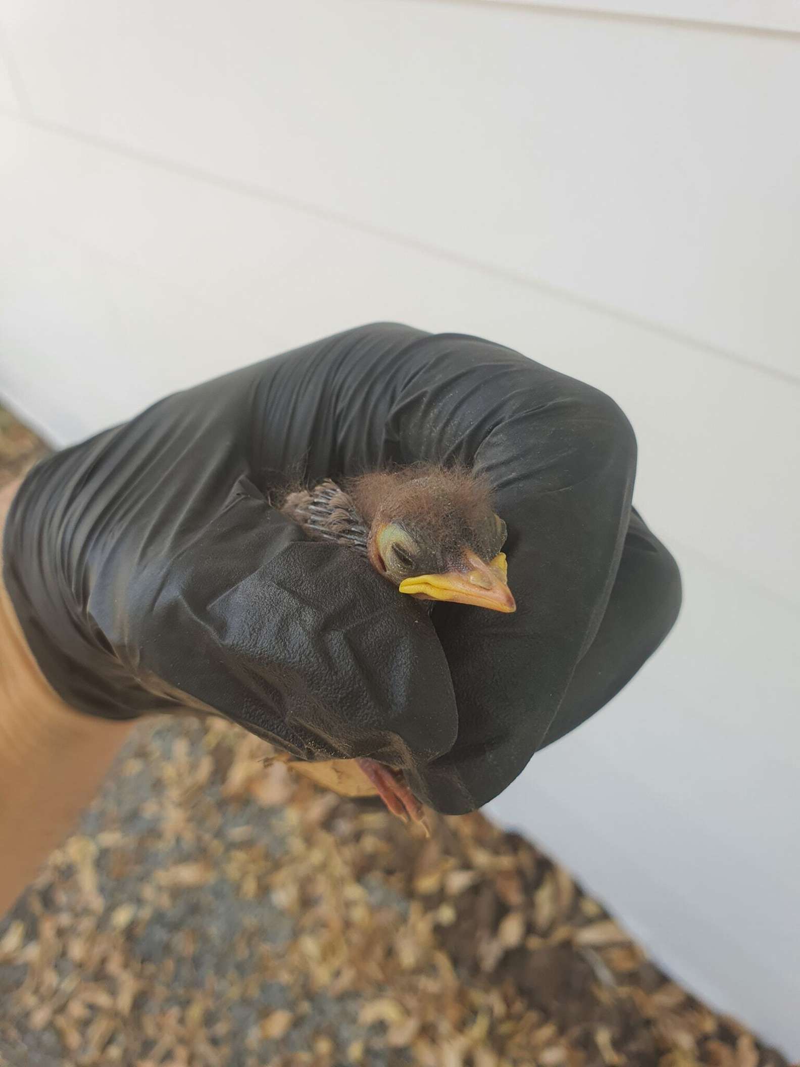 ▼Gus在Hart身邊叫一會兒,又跑出去。牠兩邊來回跑,看起來憂心忡忡。Hart跟著牠出去看了看,竟然在樹下發現一隻雛鳥。牠從鳥巢裡掉下來,迫切需要幫助。