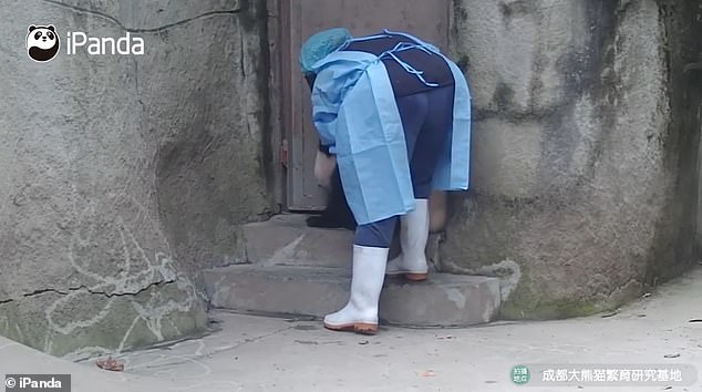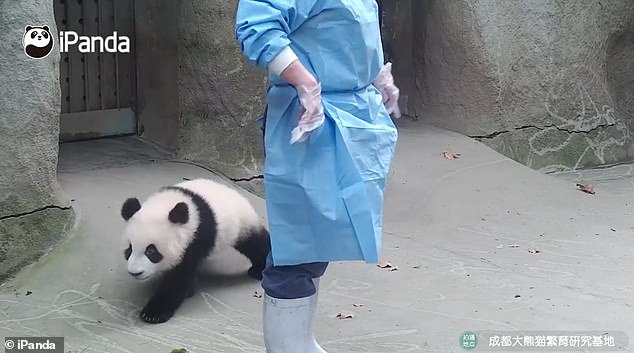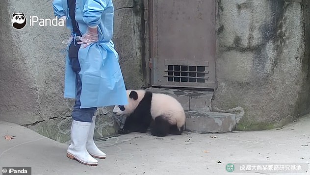 ▼熊貓寶寶撒嬌耍賴不許飼育員離開: