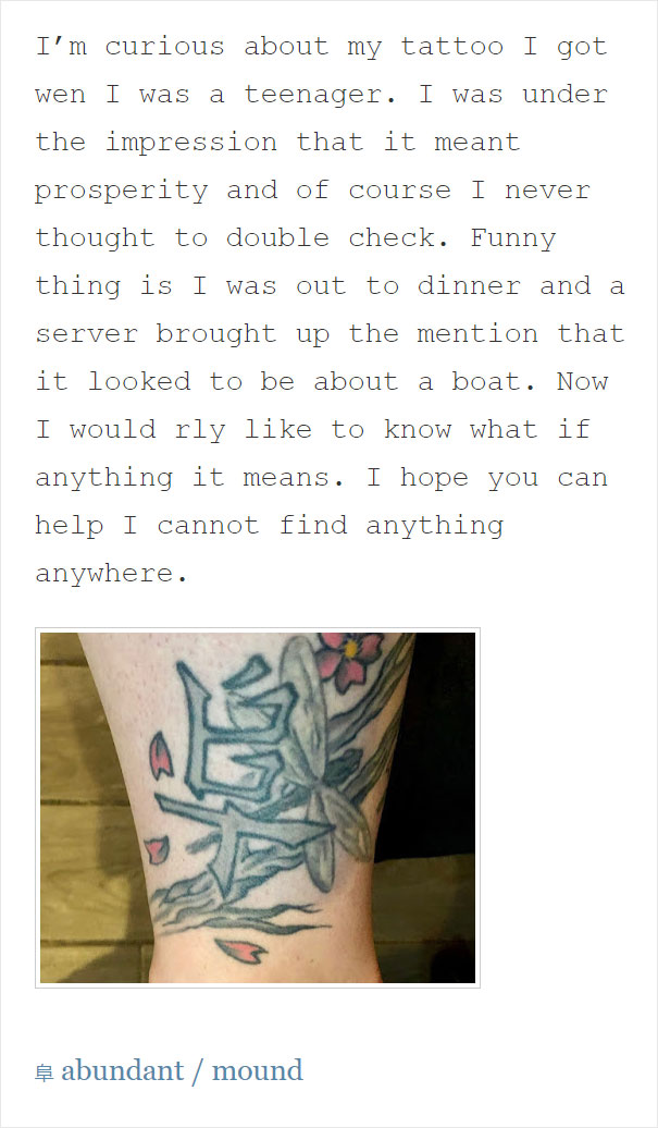 2020年11月06日刺青是一輩子的事,所以刺青之前要考慮清楚,至少要弄明白想要紋的圖案、文字是什麼意思。如果想紋的圖案不是母語,更要三思,萬一弄錯含義或寫錯字就尷尬了。下面是一些讓人百思不得其解的刺青圖案,快來看看吧。
