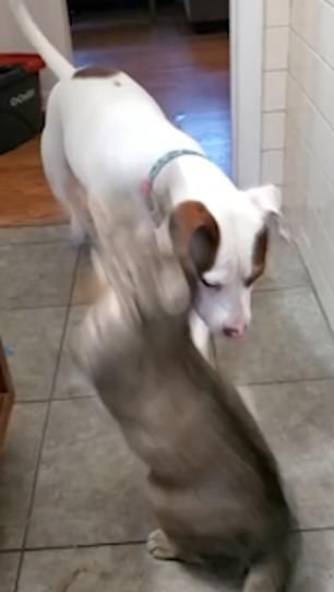 ▼只見Marvin迅速跳到洗手台上,假裝玩水。Louie在大狗狗的掩護下順利走進浴室,這有趣的一幕把主人逗笑了。