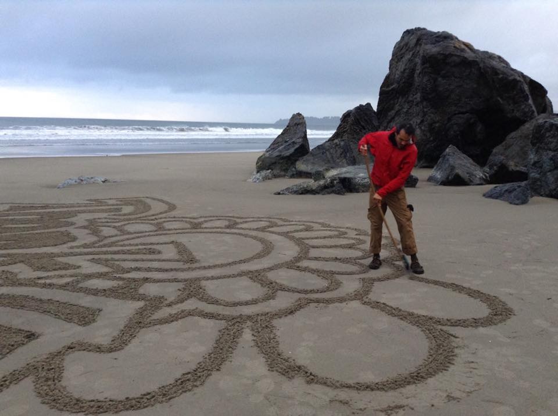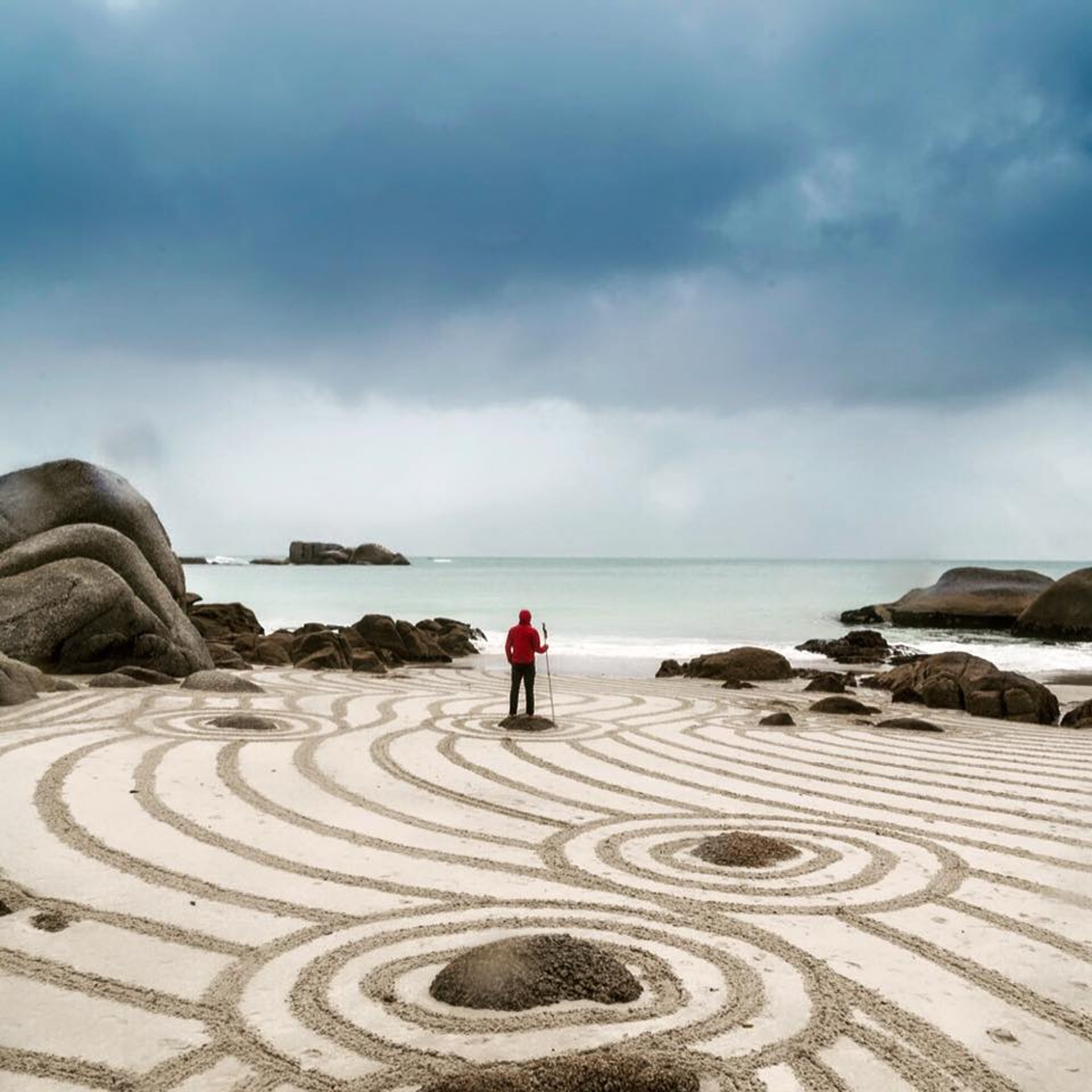 ▼人們將Andres Amador稱為「地景藝術家」,因為他會使用天然材料來創造景觀。他用耙子作畫,在北加州和世界各地的海灘上創作大規模的幾何圖案。