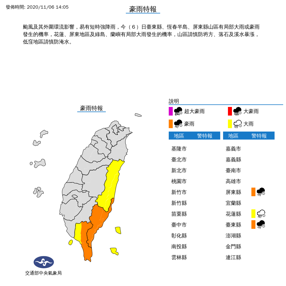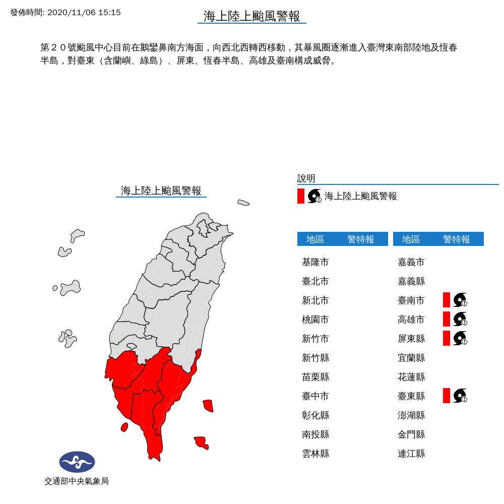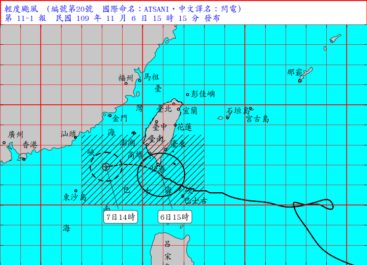 2020年11月06日今年首個陸上颱風警報!閃電颱風的風圈已經於今天上午10時觸陸,中午過後,恆春半島、南台東地區的風雨將迅速增強,越晚風雨感受會越大。氣象局表示,台東、屏東、高雄、和台南四個縣市都在範圍內,隨著颱風逼近,沿海風浪會增強,東南部、恆春半島已有10級以上強陣風,蘭嶼、綠島則觀測到14級強陣風。長浪會出現在西部沿海、宜蘭北海岸。隨著下午東北風增強,北部和東部可能出現局部豪大雨。