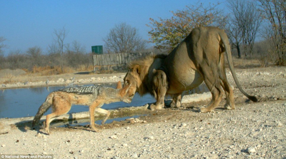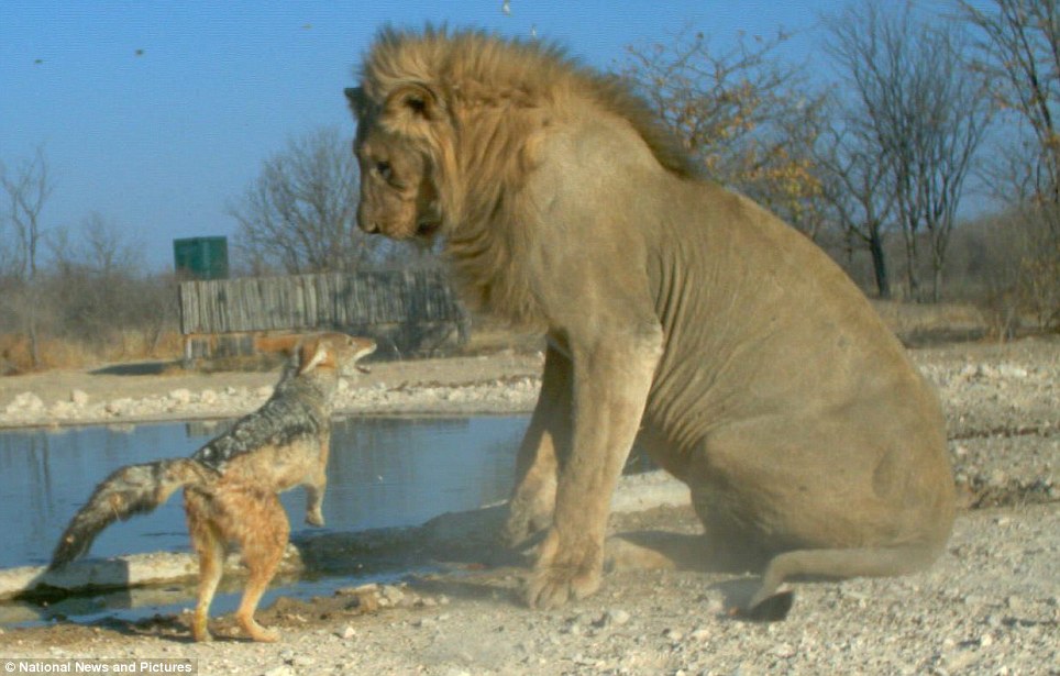 ▼當時雄獅正低頭在河邊喝水,狐狼從牠後面走過去,沒想到喝完水的獅子沒注意到身後的狐狼,狐狼就這樣被獅子重重地壓在屁股下面,幸好狐狼身手敏捷,才從縫隙中掙脫。自然保護區的研究人員正巧拍下了這一幕,讓他們沒想到的是,面對龐然大物一樣的雄獅,這只狐狼沒有選擇忍氣吞聲,而是氣噗噗找獅子單挑!