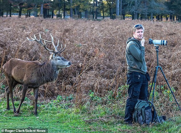 2020年11月09日野生動物攝影師想要拍到一張好照片,可能要等很長時間~日前75歲攝影師Roger Clark在倫敦灌木公園(Bushy Park)中拍到了很有趣的一幕。另一位攝影師專注工作時,竟有一隻雄鹿悄悄走到了他的身後。