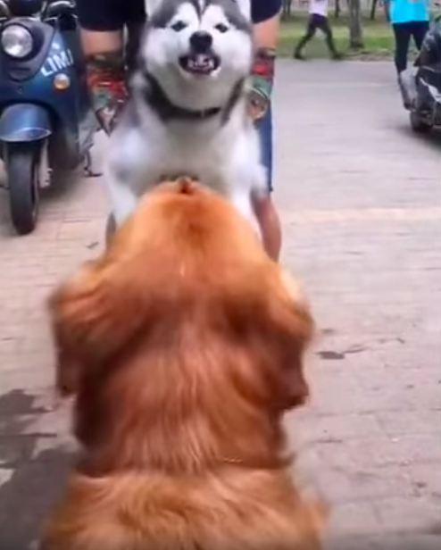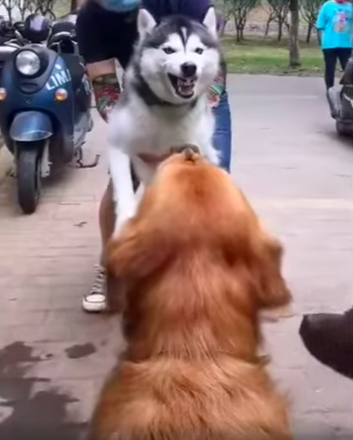 ▼從影片中可以看到,哈士奇和阿金吵得非常兇,旁邊還有別的狗狗圍觀,現場氣氛很緊張,大家都非常擔心。哈士奇一臉兇狠、露出牙齒,看起來超派。主人連忙抱住牠,就怕牠失去控制,真的衝上去跟阿金單挑。