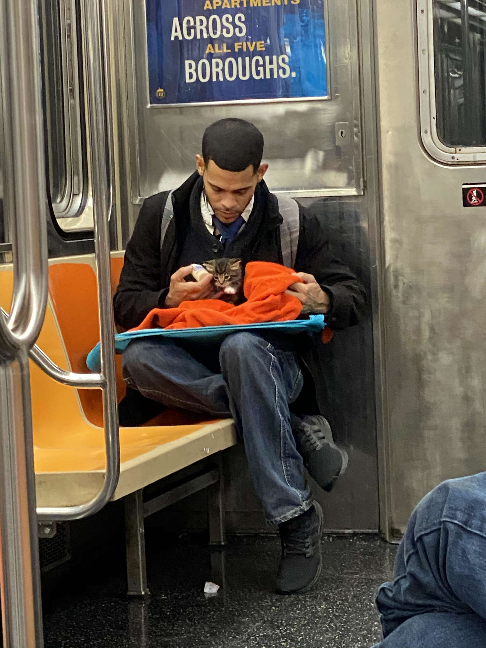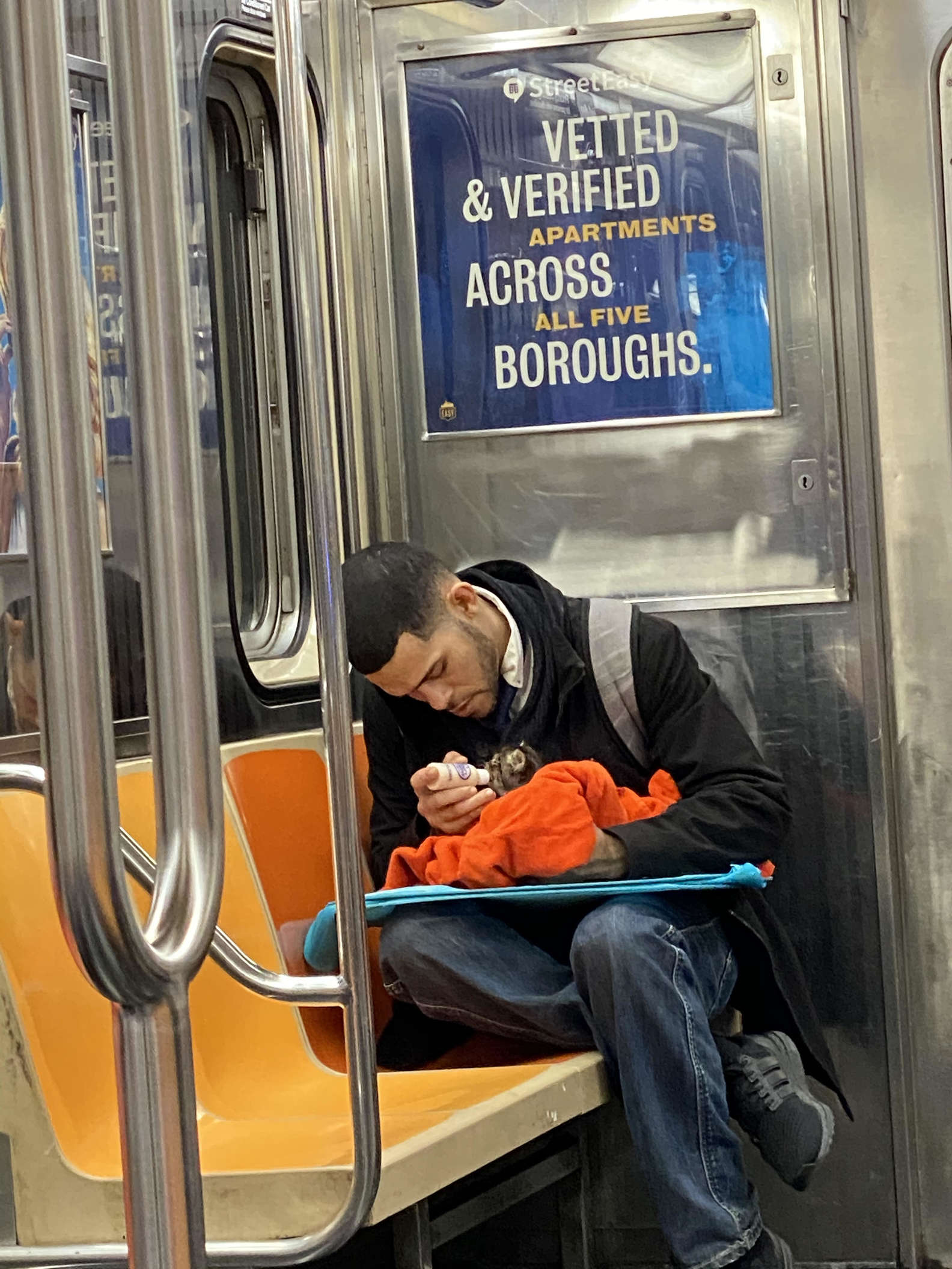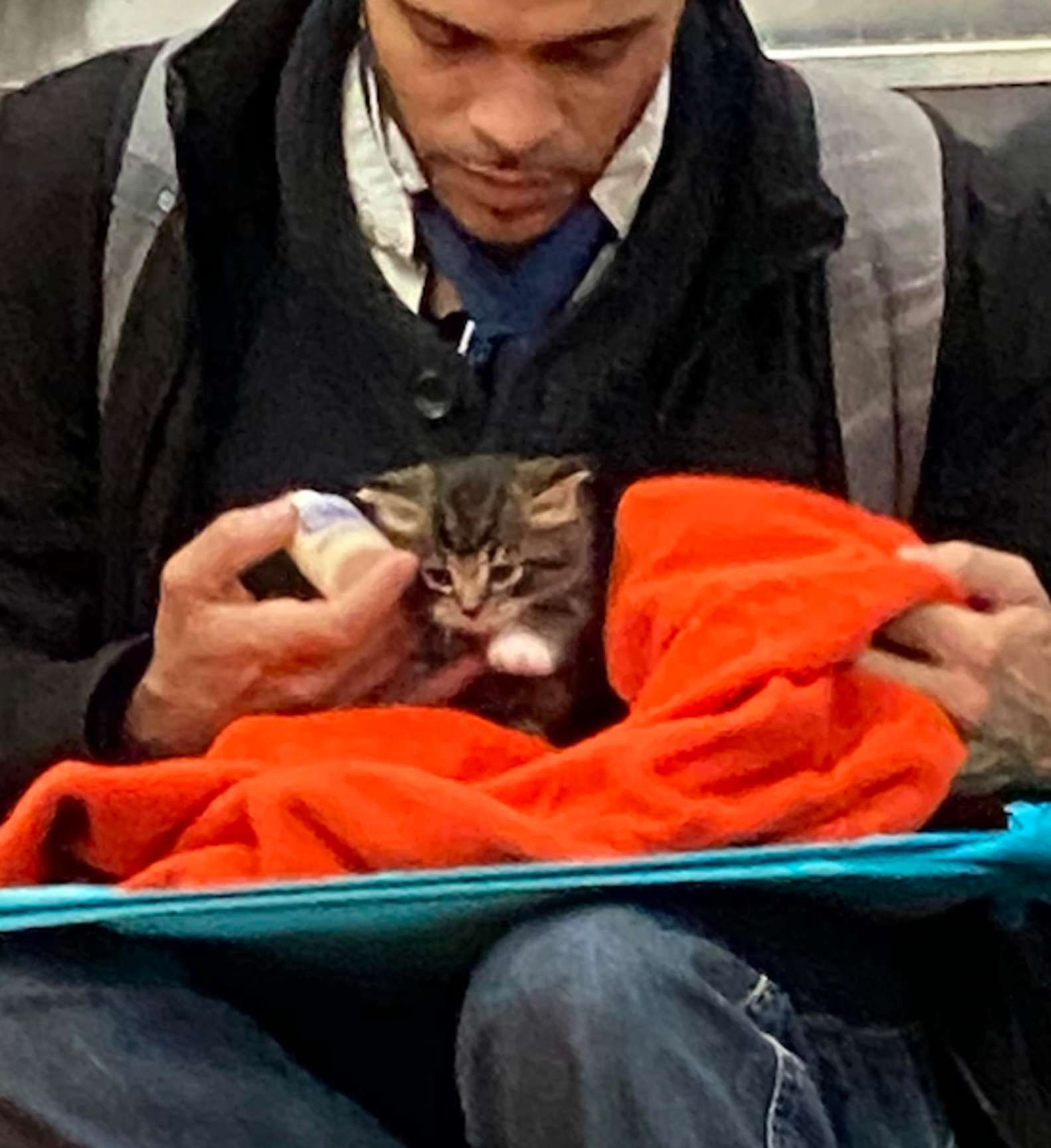 2020年11月13日地鐵中竟然有這麼美好的風景!日前美國紐約女子Gillian Rogers搭乘地鐵回家時,注意到一名特別的男乘客。他的懷裡有一條毯子,毯子中竟包著一隻萌萌的小奶貓。男子正拿著奶瓶,細心給小貓餵奶,那超暖的畫面讓人很感動。