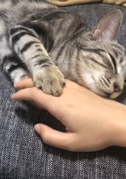 ▼影片中的貓咪正躺在沙發上度孤。牠將下巴靠在主人的手上,還用前爪輕輕抱著主人的手指。主人看貓咪睡著,想將手抽出來,原本以為貓咪睡得那麼香甜,應該不會有感覺,沒想到牠竟然馬上察覺到主人的意圖,下一秒就醒來,盯著主人看。
