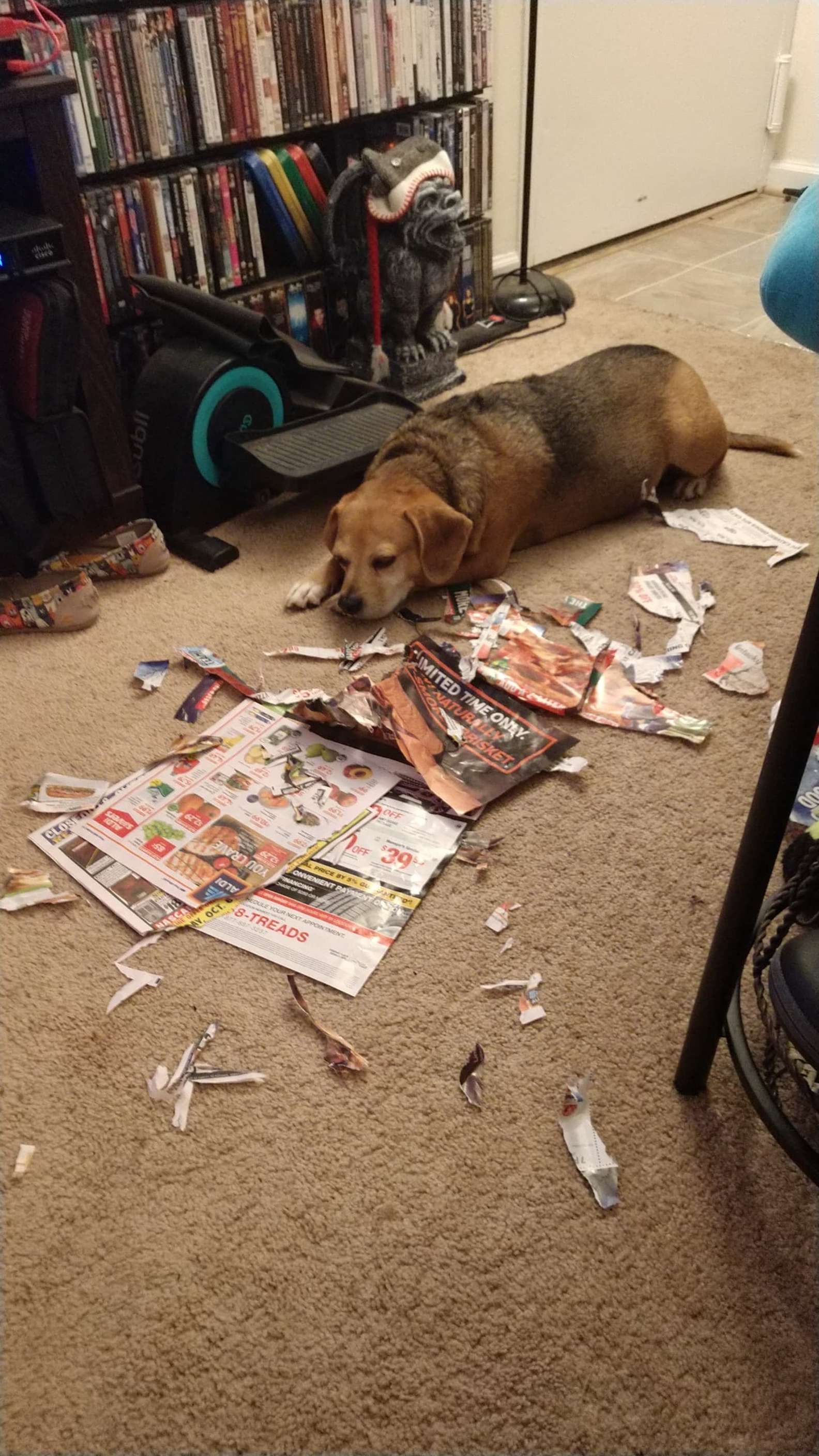 ▼Lewis說:「我一開門,看到的就是一片混亂!牠咬爛6個紙箱,全都撕成碎片;打開廚房的安全門,破壞垃圾桶,幸好沒有把垃圾弄得到處都是。」Lewis頭疼地看著眼前的一切,J.J.卻非常驕傲。牠坐在垃圾堆裡,臉上掛著燦爛的笑容,似乎在向Lewis介紹自己的成果:「這是我的藝術創作,是不是很棒?」