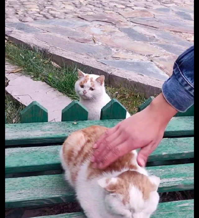 ▼當時橘貓坐在草地上看風景,奴才發現公園的座椅上還有一隻貓咪,就湊上去摸了幾下。他的行為都被橘貓看在眼裡。