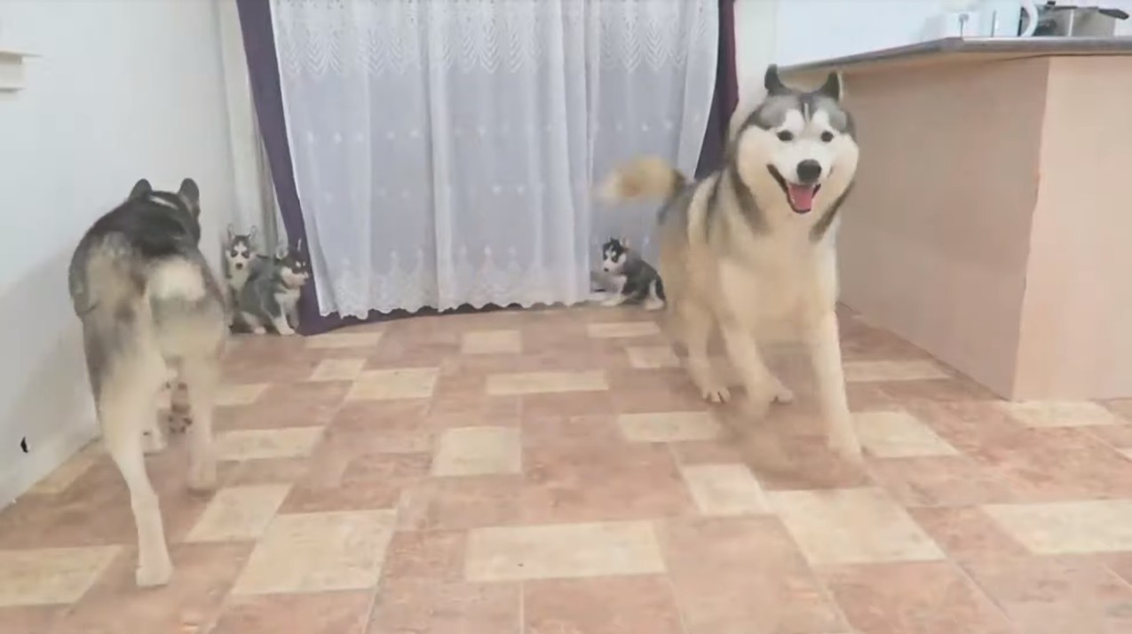 ▼看著開心得跑來跑去的哈士奇爸爸,哈士奇媽媽倒是一臉無奈,仿佛在表示「冷靜一點,你嚇到牠們了!」