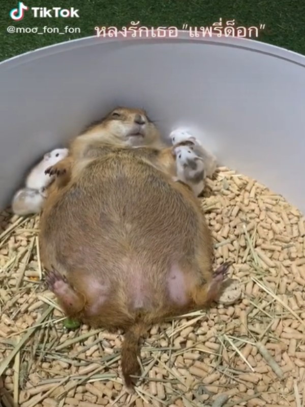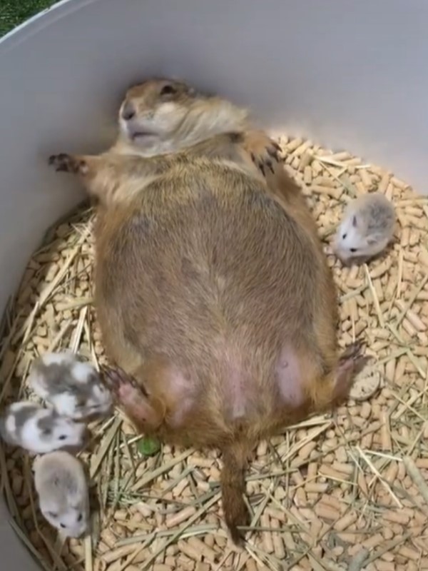 ▼影片中的這隻土撥鼠胖乎乎的,牠仰躺在窩中,圓滾滾的肥肚看起來很Q彈。牠睡得正香,身邊有5、6隻小倉鼠跑來跑去開心玩,牠也完全不在意,自顧自沈浸在夢鄉裡。