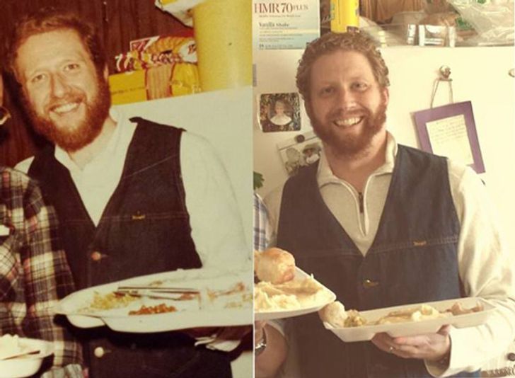 ▼父與子,兩張照片拍攝的時間相隔35年。