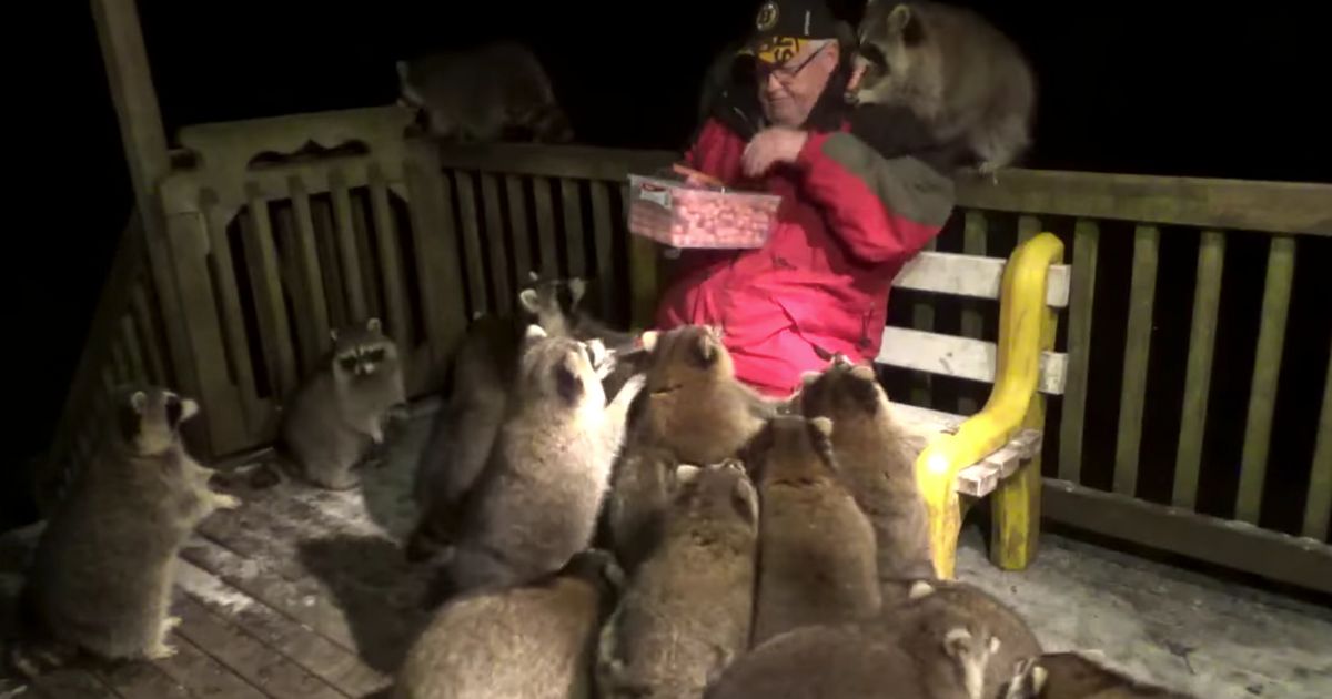 2020年11月18日加拿大新斯科細亞省(Nova Scotia)有一名叫James Blackwood的退休警察,他經常在YouTube上分享「給浣熊餵食」的影片。在最近上傳的影片中,James被17隻浣熊包圍,就像被淹沒在浣熊堆裡一樣,那畫面非常有趣!