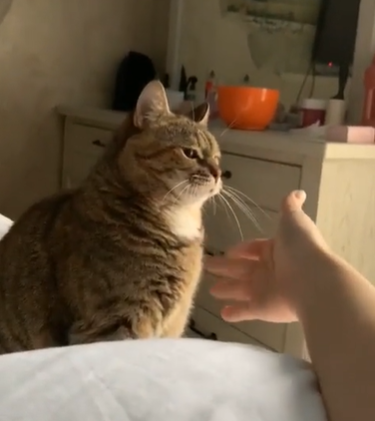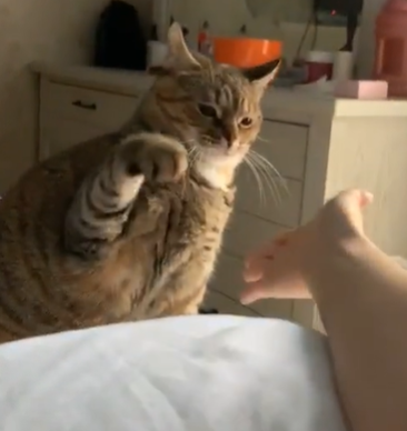 主人伸手要擊掌 貓咪滿臉不情願才「奮力一巴」:要就給你!