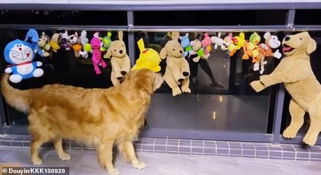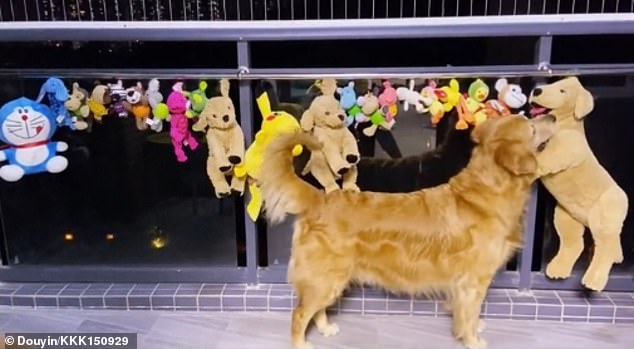 ▼從影片中可以看到,陽台上掛著大大小小十幾個絨毛玩偶,這都是Kang Kang的寶藏!牠坐在陽台上守護自己的寶貝,媽媽讓牠進來牠也不為所動。媽媽只能跟牠講道理:「快進來吧,玩具還沒有乾。」