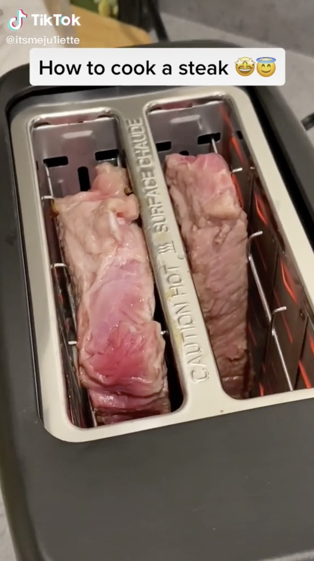 ▼在這段「為男友烤牛排」的影片中,Juliette將2片超厚的生牛排塞進吐司機的兩邊,然後調成中火按下開關。這樣來回烤了幾次後,牛排終於熟了。Juliette吃得津津有味,還在文末附上「主廚(chef)」的主題標籤。