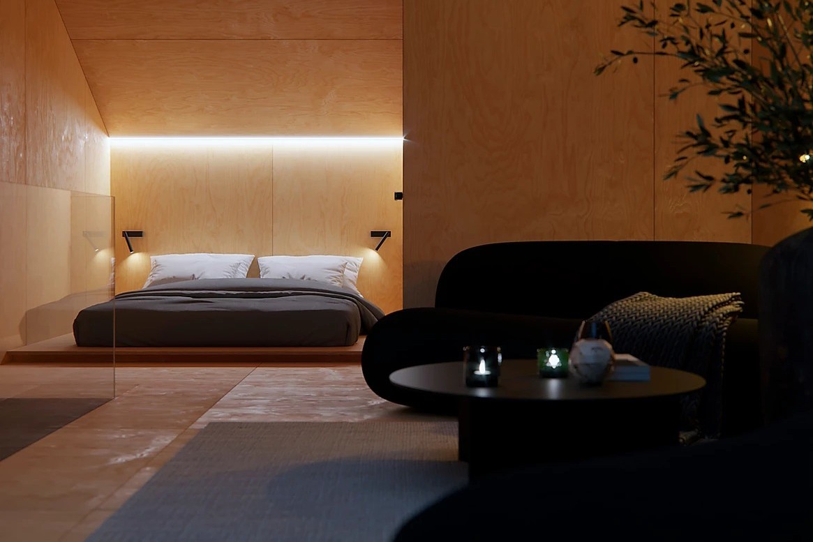 ▼二樓則是休息區,沙發區和臥室連通,同樣採用木色和黑色的強烈對比,顯得格外和諧。來到這裡能夠完全放鬆。