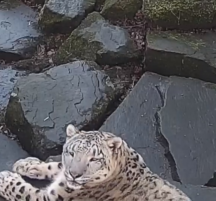 ▼Jessie還舉起手手,做出投降的手勢。牠想把相機抓下來,但從相機拍攝的角度,牠根本就是在賣萌,那畫面看起來很療癒。原本霸氣的雪豹一時之間威嚴盡失,變成了小可愛。