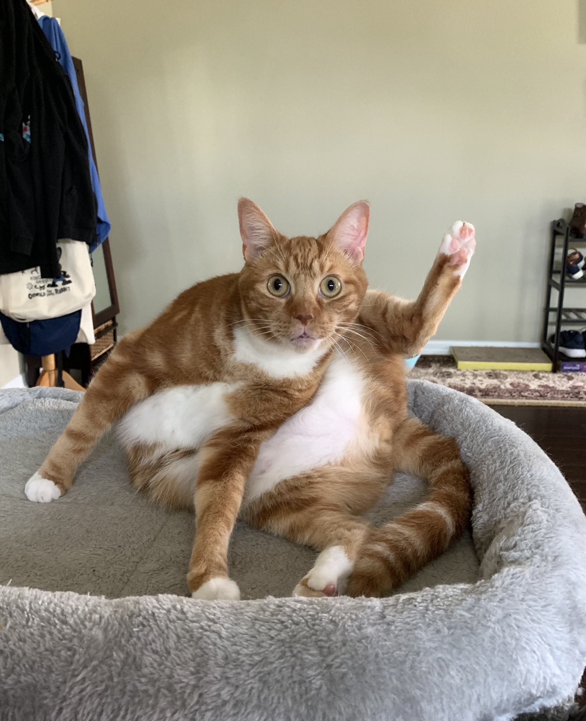 2020年11月27日貓咪不僅能塞進各種容器,還能擺出扭曲的怪異pose,那Q軟的筋骨讓人超佩服!日本推主@jazz530養了一隻叫「里歐リオくん」的橘白貓,貓咪長得很可愛,平時也很帥氣,但主人偶然拍到牠抬起後腳的迷樣造型,讓人看得忍不住笑出聲。