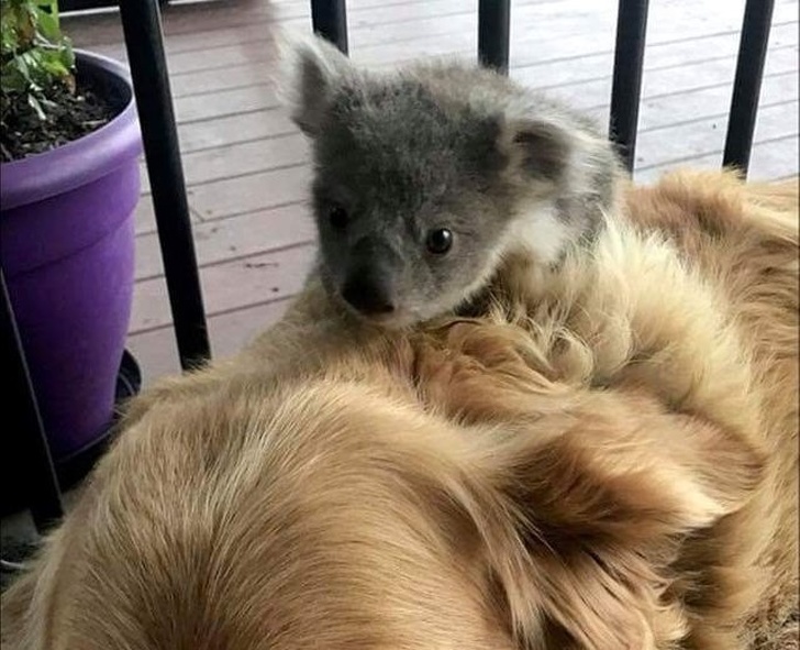 ▼來找黃金獵犬取暖的無尾熊寶寶!