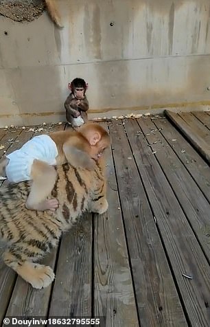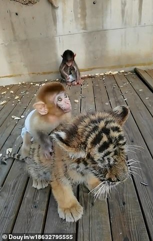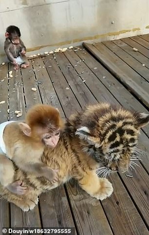 2020年11月29日跨越物種交朋友~河北衡水的野生動物園中有一隻叫「半斤」的小獼猴,牠「猴膽包天」,竟然騎在一隻小老虎的背上玩耍,一點也不害怕。小老虎似乎也習慣了這個「甜蜜的負擔」,沒有將半斤趕下來。牠們的可愛互動超療癒,讓人心都要融化了。