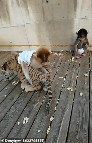 動物園麻吉!猴寶寶與小奶虎「玩騎馬馬」 網友:希望你們長大也能當朋友