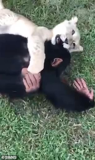 2020年11月30日美國邁阿密的野生動物園「 Zoological Wildlife Foundation」中,有一隻叫Limbani的3歲黑猩猩,牠跟6個月大的獅子寶寶Binta是好朋友。最近動物園分享了一段Limbani和Binta在草地上嬉鬧玩耍的影片,網友們都被動物之間真摯的友情感動了。