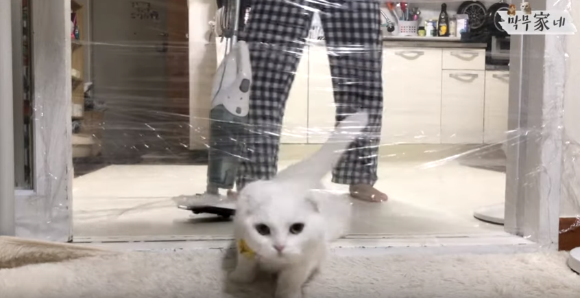 ▼而懶散的Muji就採取了消極應對的策略,在碰壁之後直接躺下休息了,直到主人拿出牠最怕的吸塵器,牠情急之下衝出了保鮮膜牆,成功通過!