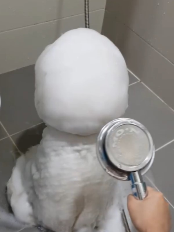 ▼這天主人給多多洗澡全身塗滿了泡泡,從背面看過去白白圓圓的酷似雪寶,主人也覺得非常可愛就拍了下來。整個洗澡的過程,多多都沒有亂動,超配合主人。