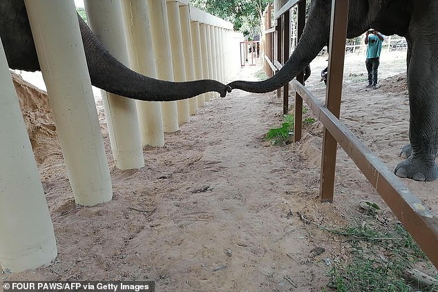 2020年12月02日巴基斯坦大象Kaavan過去30多年來一直被鎖鏈鎖在狹小的環境中,現在牠終於移居柬埔寨,能在野生動物保護區展開新生活了。12月1日,Kaavan在保護區伸出象鼻跟其他大象問候,這是牠過去8年來第一次跟同類接觸,那畫面讓人很感動。