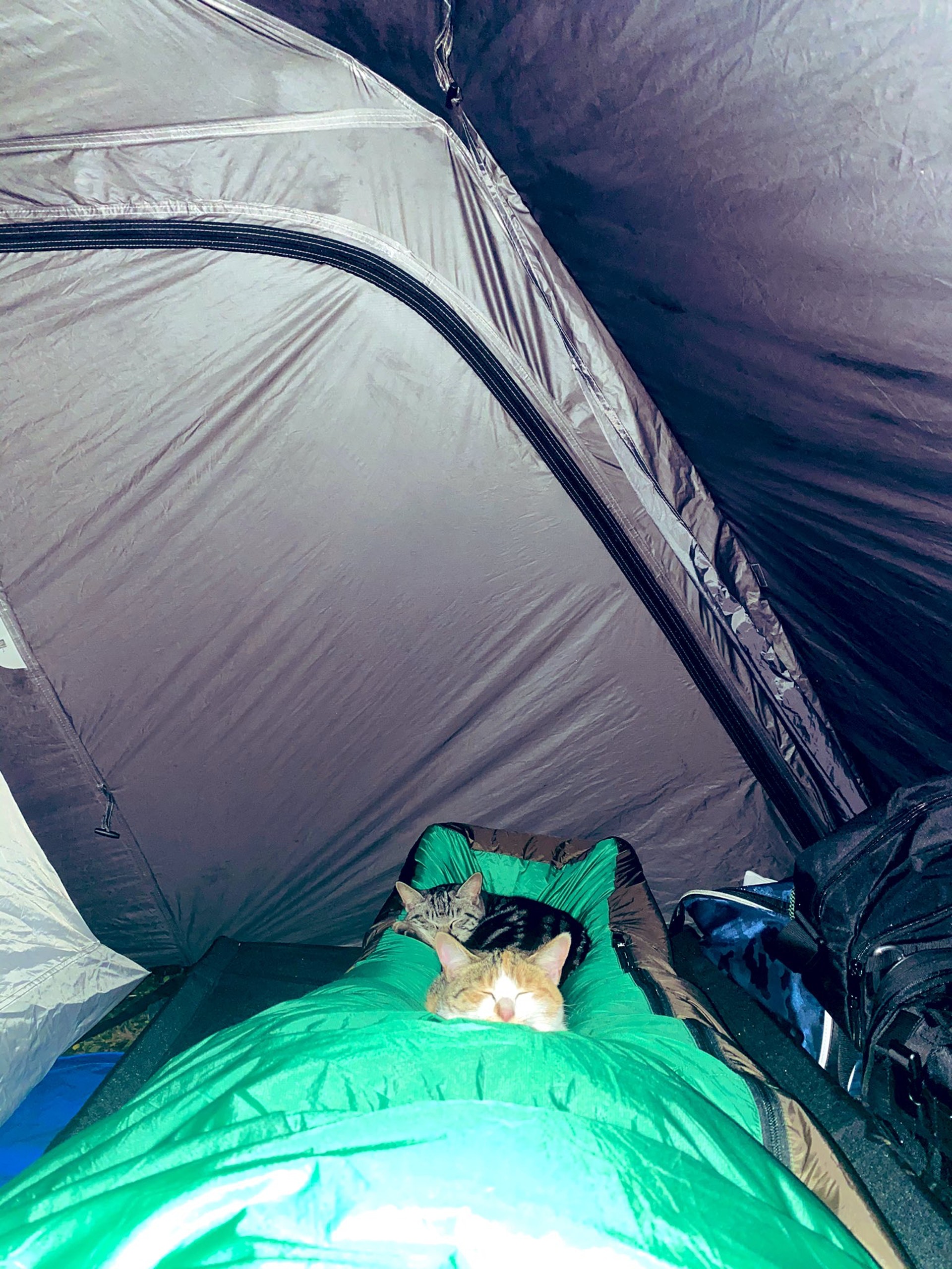 2020年12月04日COVID-19期間去熱門景點旅行不安全,所以很多人選擇露營,到大自然中放鬆身心。最近日本推主@awesome_hnysk去露營,睡到半夜時突然感覺雙腳被重物壓住。他心中不安,又非常好奇,猶豫片刻還是用手機的手電筒照了一下,這才發現兩位不速之客-2隻浪貓~