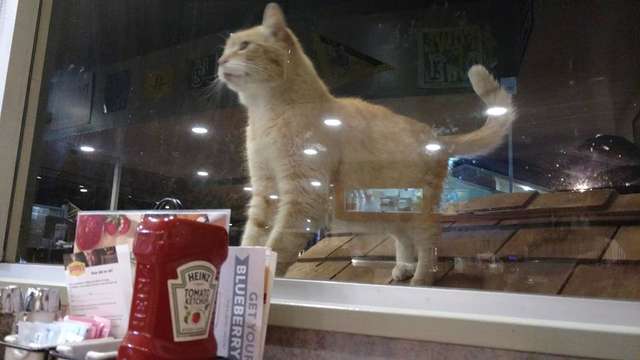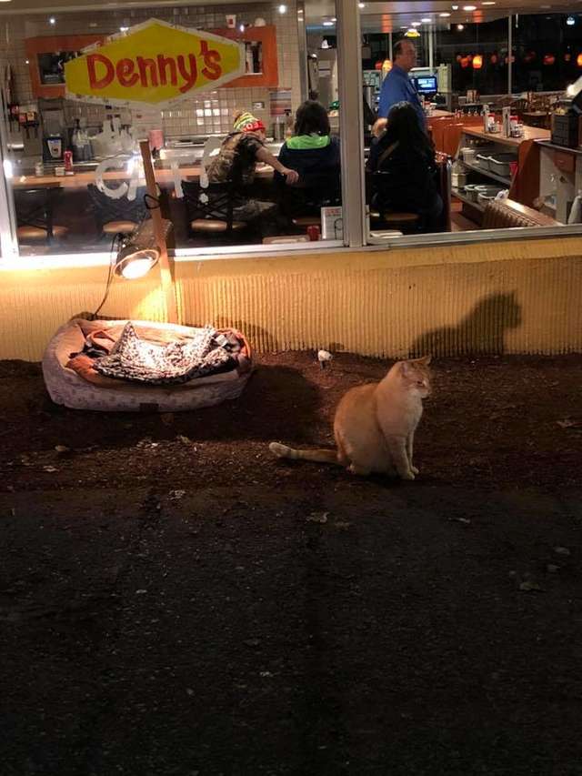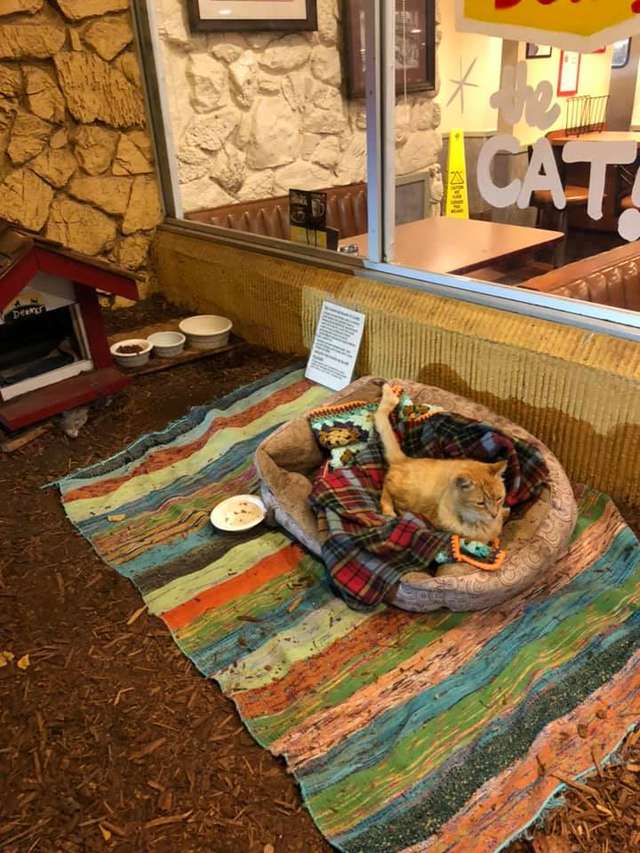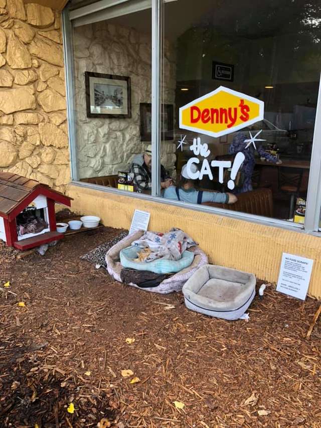 ▼這隻貓咪把小餐館當成了自己的家。牠的小窩就在櫥窗外,牠會在這裡休息、吃飯。人們也給牠取名為「Denny's」,或叫牠的暱稱「Denns」。