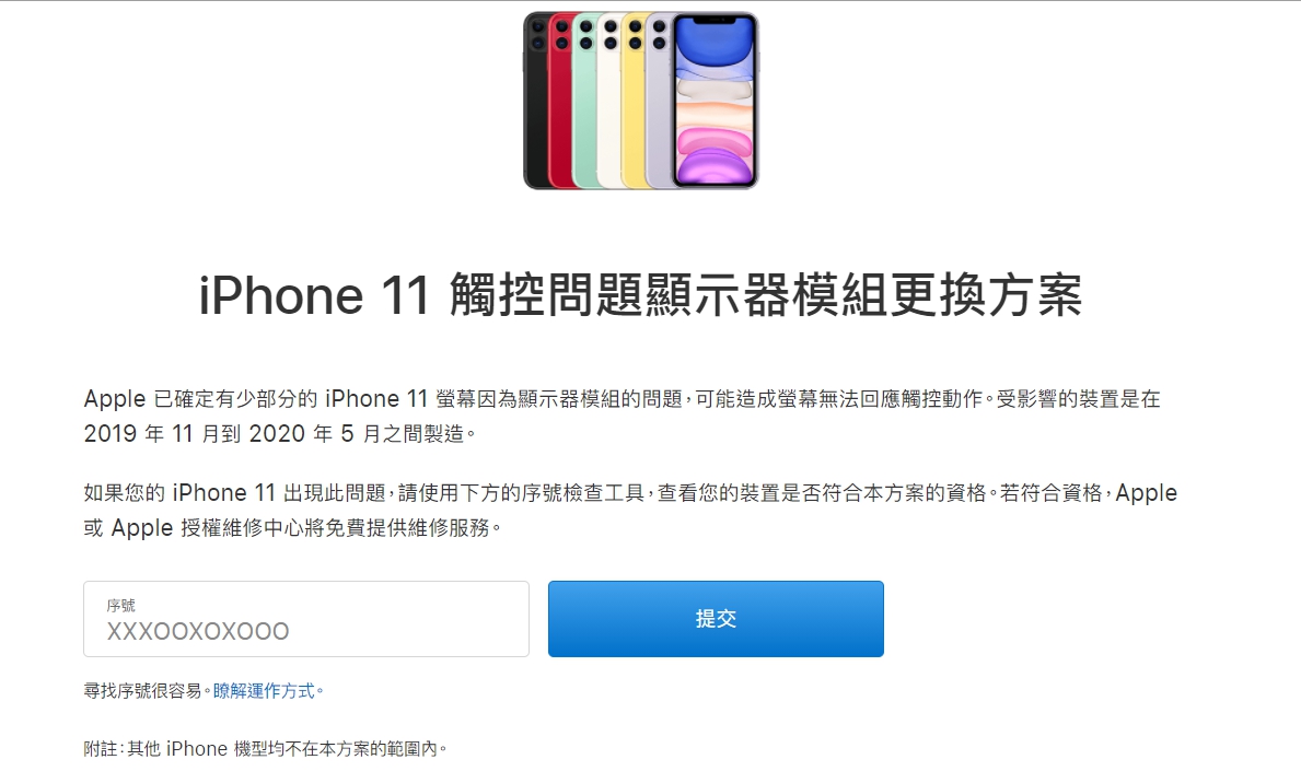 如果你手上的iPhone 11有觸控不良的情況,可以先上蘋果公司官網輸入序號檢查。符合資格的話就能到Apple授權維修中心,或向Apple零售店預約,會有免費維修服務。維修之前最好先將iPhone備份一下。