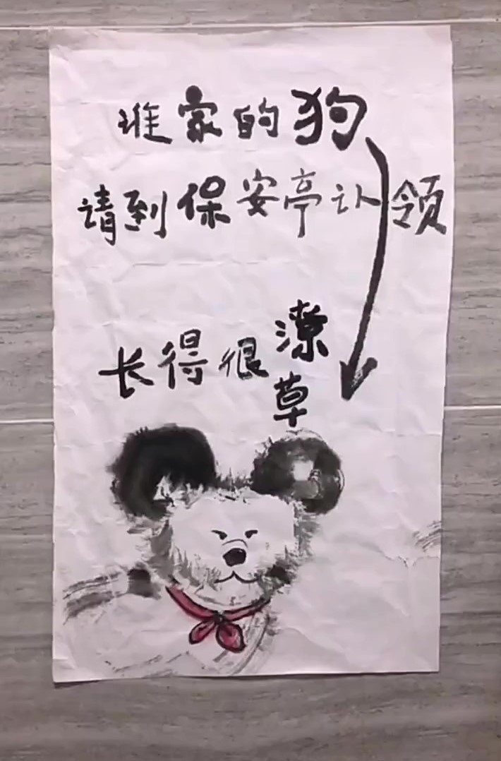 ▼只見牆上貼著認領畫像,並寫道:「誰家的狗?請到保安亭認領。長得很潦草。」用水墨畫手繪的狗狗畫像非常醜萌,狗狗有米奇一樣的大耳朵,還有芝麻般的小眼睛、比例怪怪的鼻子,臉上的毛髮凌亂,脖子上繫著紅色絲巾,特徵非常明顯。