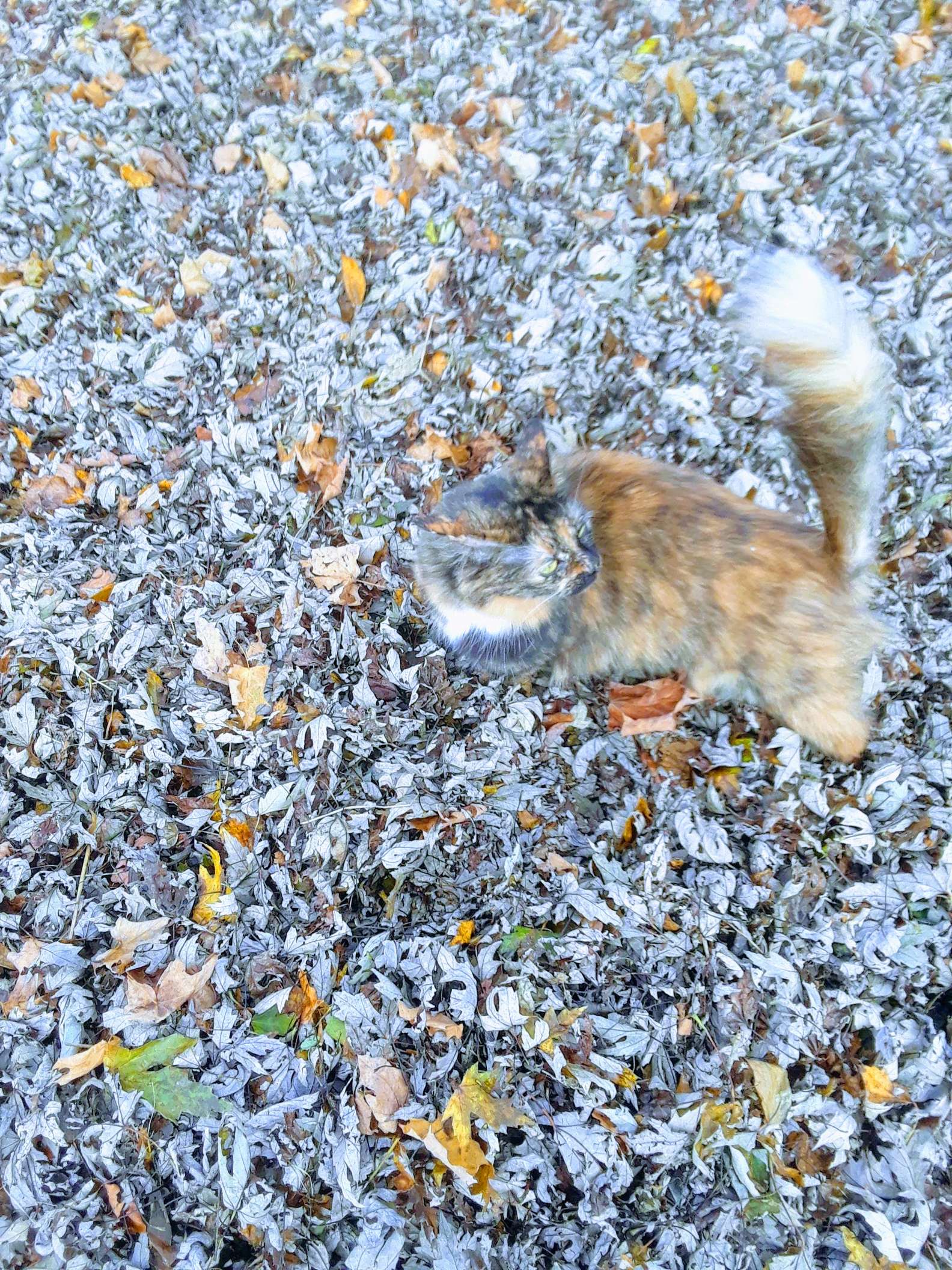 Lion是一隻玳瑁貓,全身的毛毛大多是橙色和黑色,也有少量的白毛,所以能夠輕鬆在落葉堆中隱身。平時牠在家裡很囂張,喜歡跟馬麻玩,還會對其他毛孩哈氣,發出嘶嘶聲。除非牠自己想藏起來,否則誰也無法忽視牠。牠躲在落葉堆翻滾、賣萌,還能順便隱身,這超強的技能太厲害了~