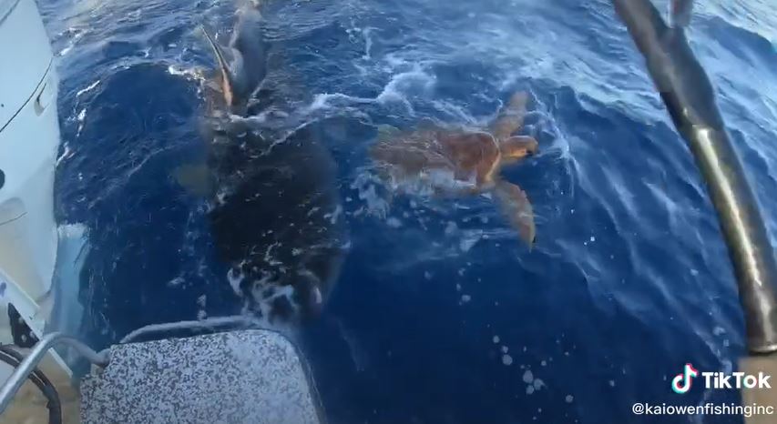 @kaiowenfishing Giant tiger shark tries to eat turtle! #nature #fyp #viral #bahamas #worldwide