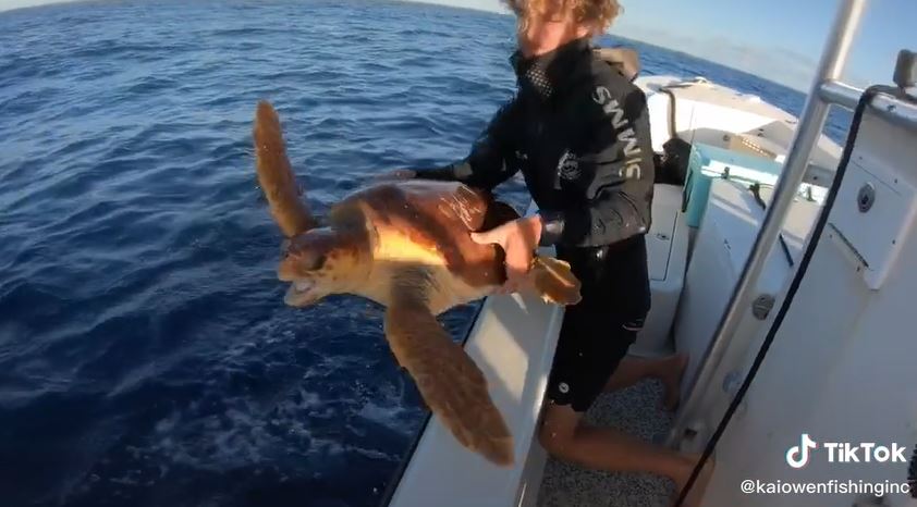 拍攝者終於救了~ 大海龜遇鼬鯊捕食「全力游向小船」 釣客伸援手救起:下次要小心喔
