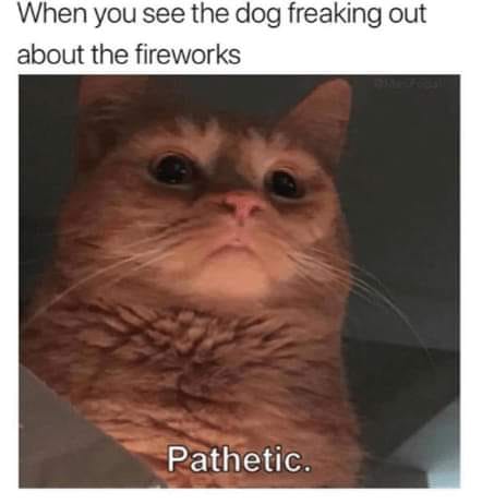 ▼狗狗正因為煙花興奮不已,貓咪一臉冷漠:「可笑的靈魂。」