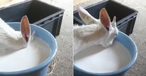 ▼小羊把整顆頭都塞進裝滿羊奶的桶裡,連眼睛都泡在裡面,因為太急著喝奶,把呼吸都拋在腦後了。