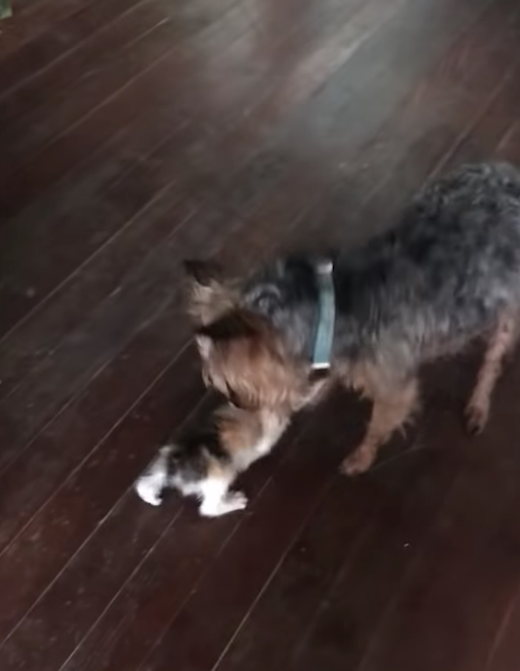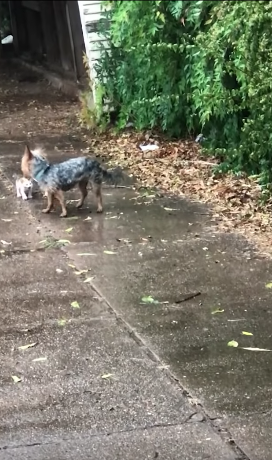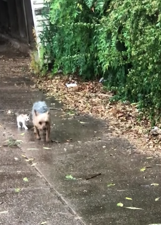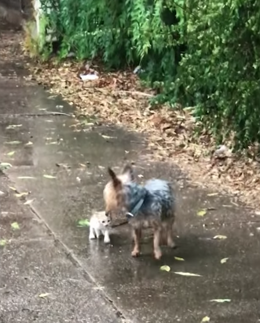 超暖約克夏雨中當小奶貓的「守護天使」 一路盯著牠:我帶你回家取暖!